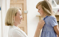She is helping her daughter to get dressed.