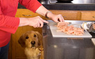 The dog was smelling the chicken on the counter.