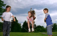 The children are playing on the swing set.