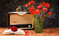 The flowerpot is next to the radio. The flowerpot is next to it.