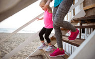 The kids are going up the staircase together.