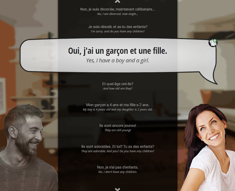 The Conversation lessons are just simple examples of everyday dialogue, but they can be very effective. You can use the arrow buttons at the top and bottom of the page or click and scroll on both sides to navigate through the conversation. You can also click on any reply to repeat as many times as you want. The conversation will play, you listen, pay attention and learn. 🙂 Repeating aloud will help your pronunciation in a big way. Remember, if you need to hear a reply again, simply click on the line of dialogue.