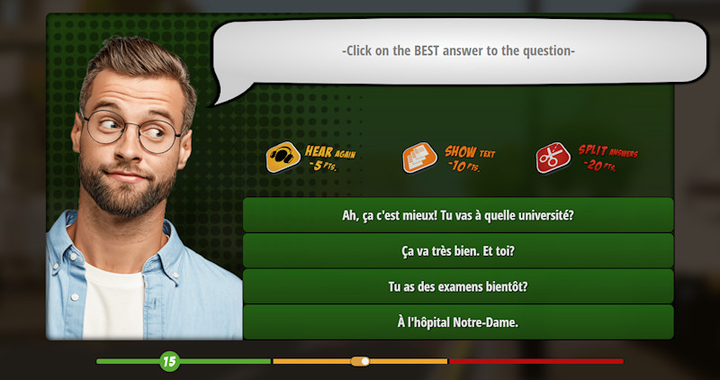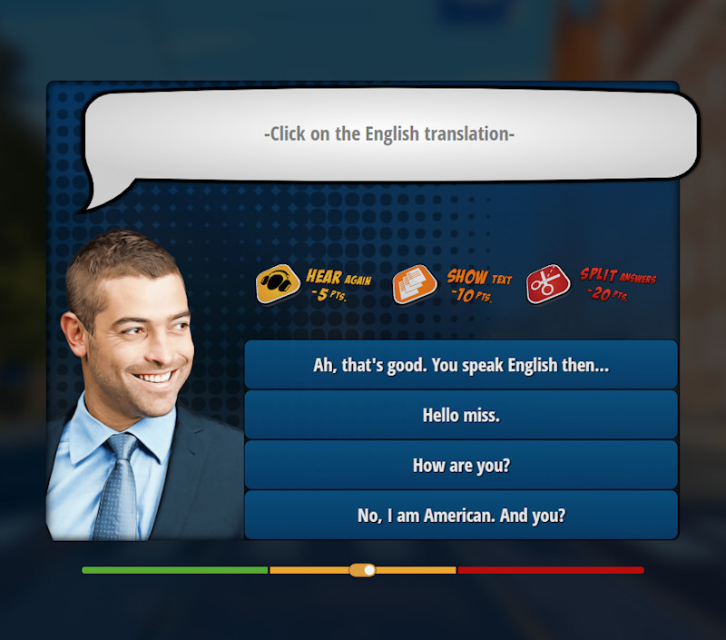 Level One: Translation Snap. In this exercise, you will hear a reply from the conversation you just listened to and you will need to click the English equivalent from 4 possible choices. This exercise is great to train your ear to listen and understand this new language and should be very easy. You need to answer quickly to get the most points for each answer. We also included three hints that can help you if you don’t know the answer. Keep in mind that these hints, although very helpful, cost you points every time you use them. Be careful not to use them too often or your final score might not be as high as you hoped.