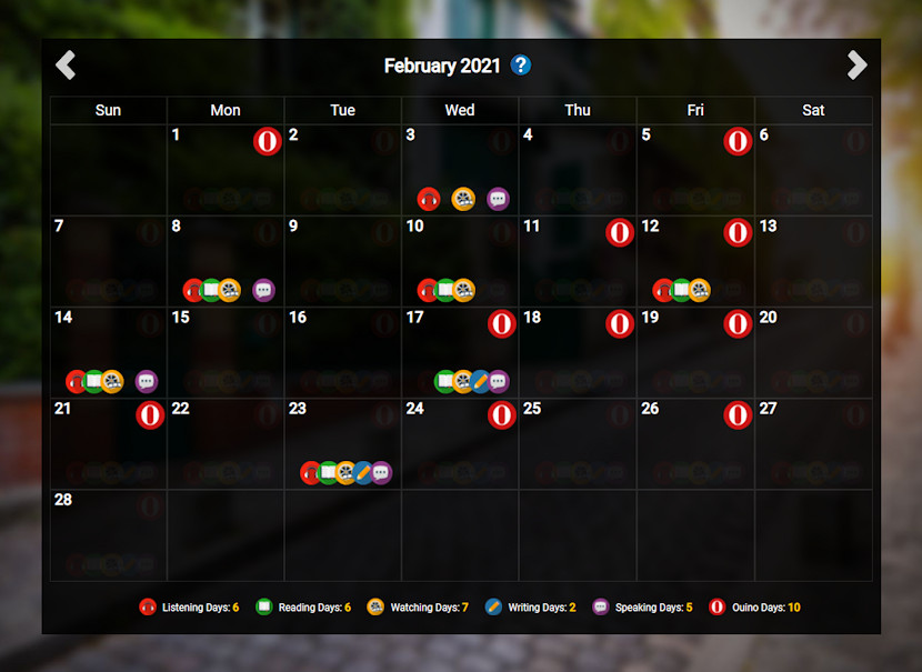 By using the Ouino calendar, you will be able to visually see the areas you need to work on. For example, if you have 20 listening badges at the end of the month, but only 1 speaking badge, you may want to try and increase your speaking activities in the next month. You certainly don’t need to do every learning activity each day (unless you’re superhuman), but you should try to find a nice balance in your language-learning schedule and tweak your goals if you want get the most out of your learning time.