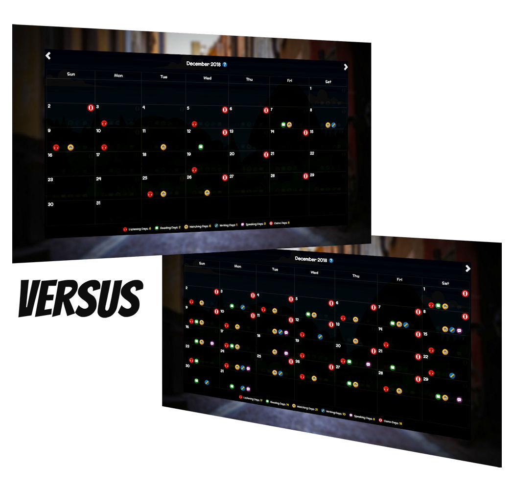 Now let’s take a look at Tom’s calendar. Tom loves languages, but he works full time and loves to spend nights and weekends with his friends. Tom used Ouino for 8 days in the month, has 5 listening badges, 2 reading badges, 6 watching badges, 1 writing badge and 0 speaking badges. From this observation, it is easy to see that Tom will have made much less progress than Julia, but Tom is okay with that. It all depends on your goals and reasons to learn the language. There is nothing wrong with learning the language more slowly, but at least it’s easy to understand why Julia made more progress. The calendar is a very good representation of how long it will take someone to learn the language. It can take anywhere from a few months to several years to learn a language to fluency. It all depends on what you accomplish every day, and you can track it all within the Ouino program.