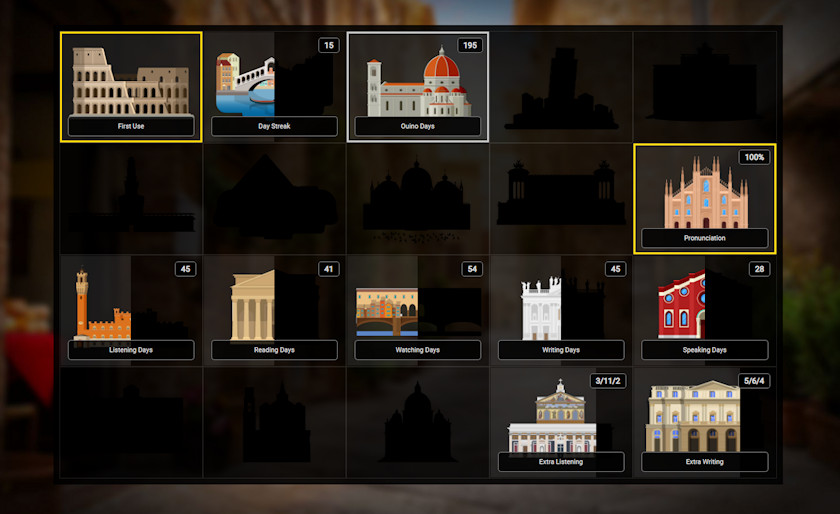 Trophies: The trophies are a fun way to see your progress. It is a visual way to see your current level and getting all of them is a real challenge. You will unlock most of them within the program, but some of them are unlocked by completing some external activities and logging them on your calendar. There is a total of 20 trophies to unlock. Try to discover them all! A user who unlocks all trophies with a golden frame should be fluent or very close to it.