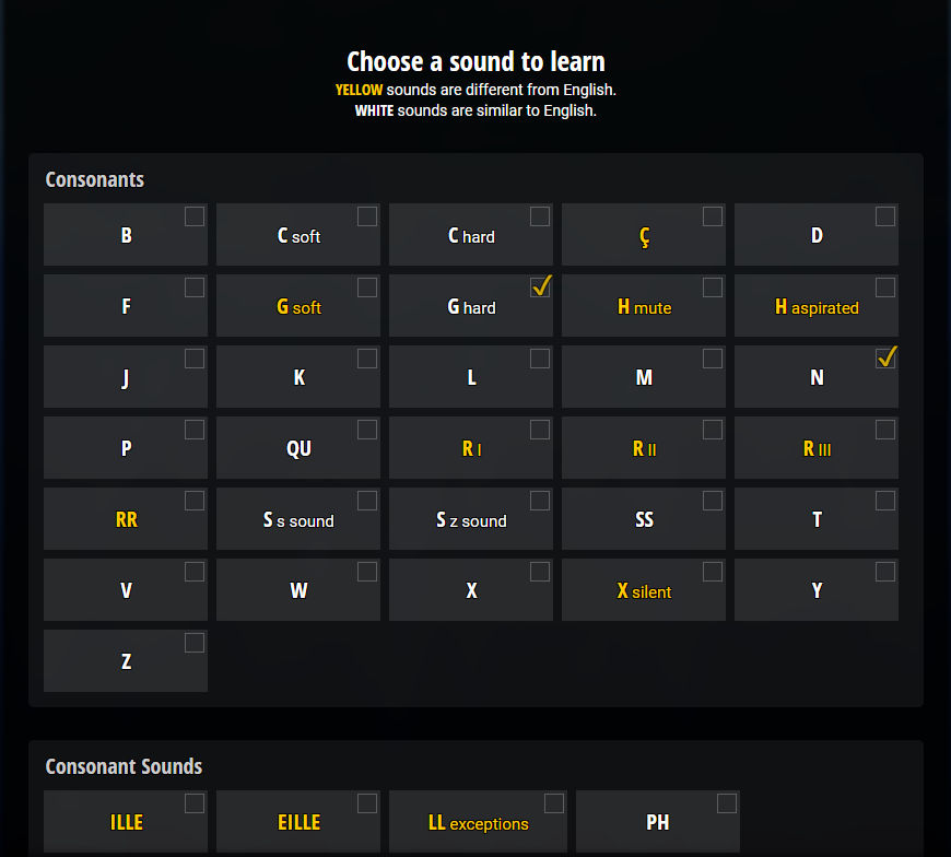 This doesn’t have to take a long time, you can quickly go through the OUINO Pronunciation module because everything you learn here will be reinforced in all other modules of the course. If you take a look at the OUINO Pronunciation module, you will see that the letters that sound different from English are identified in yellow and the letters that sound similar to English are identified in white. You can therefore go through this module very quickly by first looking at the yellow letters to see how they are pronounced.