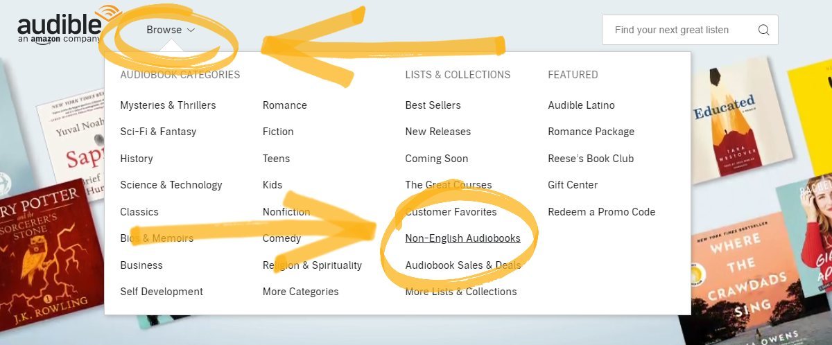 We highly recommend listening to audiobooks regularly to reinforce what you learn and get used to the language. Audible is probably the best place to find an incredible amount of listening material for all levels. Yet, many people don’t think about Audible for language-learning purposes. Here’s how to find material in your target language: